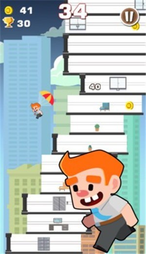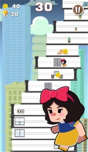 可爱的角色在地板上自动运行,点击屏幕,他会跳到下一层。当他撞到墙上时,他会反弹到相反的方向。