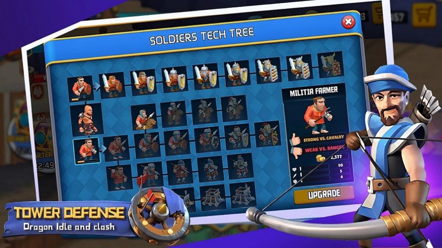 玩法有趣上瘾。在游戏里面,在游戏里玩家将招募各类初级兵种,放置在城堡内的格子中,并升级他们;