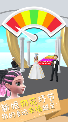 我是来结婚的作为一款挑战性十足的跑酷类型闯关手游,手游的画风与音质都非常的精致,在游戏里玩家可以随心所欲的畅享。手游的玩法也是很简单有趣的,在游戏里玩家需要操控自己的角色在游戏里面进行闯关,躲避关卡中遇到的各种障碍危机,走到终点才能与心爱的人结婚。各种不同的头花配饰礼服可以尽情的搭配,不断的装扮,将冲到第一名抢到新郎,千万不能够掉到水里面。快来争夺你的新郎吧!