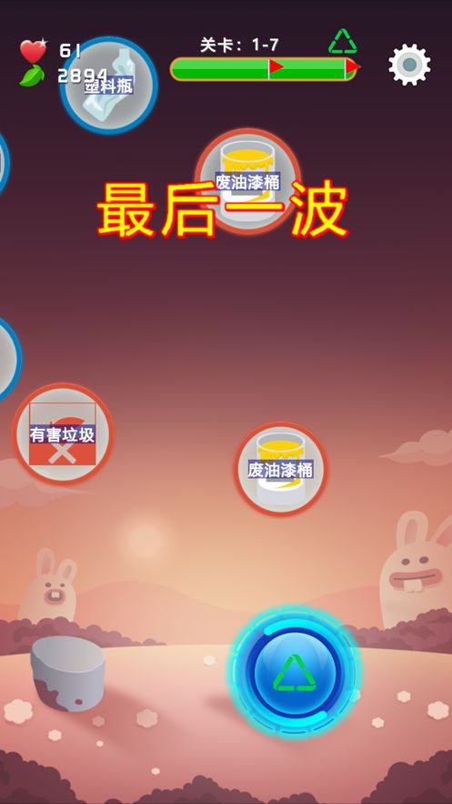 控制回收器不断吸取垃圾,获取绿色能量值。 不过要根据当前回收器中间闪烁的标识,吸取正确类型的垃圾; 如果吸收错误类型的垃圾会导致回收器损失生命!