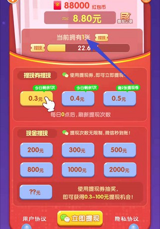 2、看几个视频拿到一张提款劵后兑换0.3元;