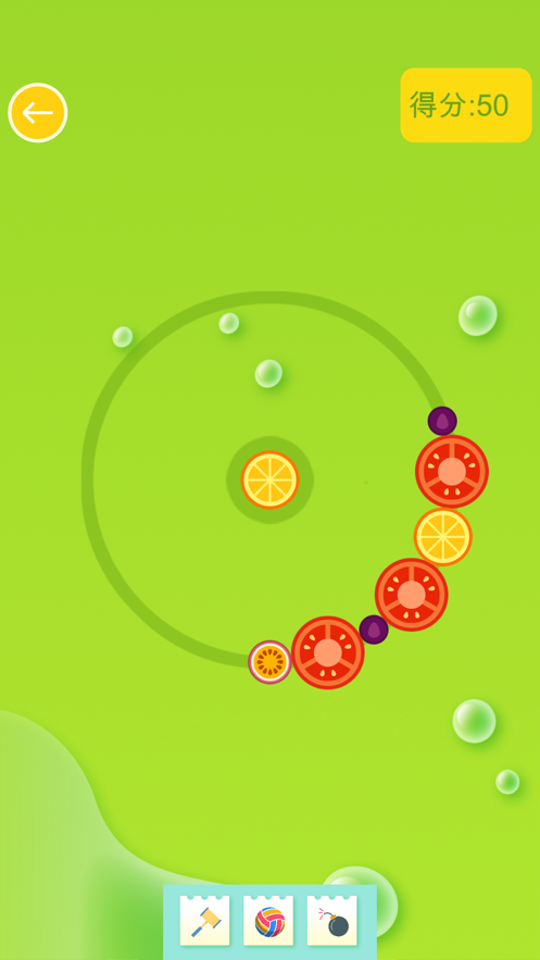 《超级水果大王》作为一款水果合成的简单操作休闲益智游戏,锤子可以摧毁指定水果并获得积分;魔法球可以将下落的水果变为指定类型水果并获得积分;大炸弹可以摧毁每一个的同类水果并获得积分;