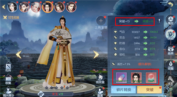 单个角色前三次突破只需要消耗突破石,但第四次突破开始,则需要同时消耗突破石和同名角色碎片。从第16次突破开始,还需另外消耗五灵丹。突破石的获取途径较为多样,在六部试炼、随从传记、寻宝、道具商店、成就等玩法中都能获取;随从碎片主要在浮生阁、随从商店中获取;五灵丹则主要通过运营活动获取。