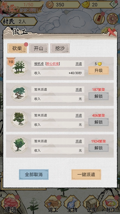 6、进入做工界面,选择【一键派遣】选项,会自动派遣村民进行做工,