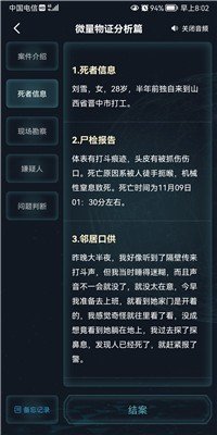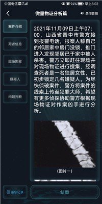 犯罪大师微量物证分析篇案件介绍:2021年11月09日上午07: 00,山西省晋中市警方接到报警电话,报案人称自己的邻居家中房门没锁,推门进入发现邻居已于家中被人杀害。警方立即赶往现场并对现场物证进行搜集,经调查死者是一名独居女性,已初步锁定几名嫌疑人。为尽快侦破案件,警方将案件的线索上传至犯罪大师,希望有更多侦探协助警方根据现场物证对作案凶手进行分析。