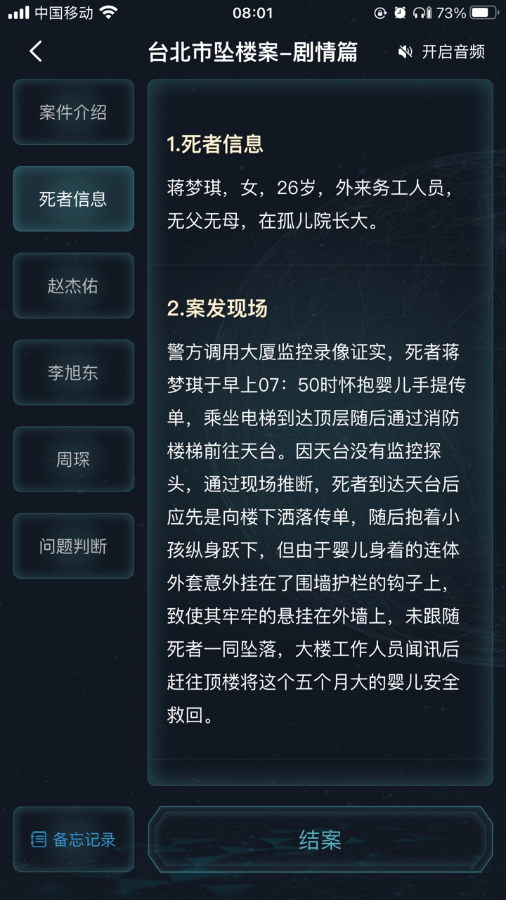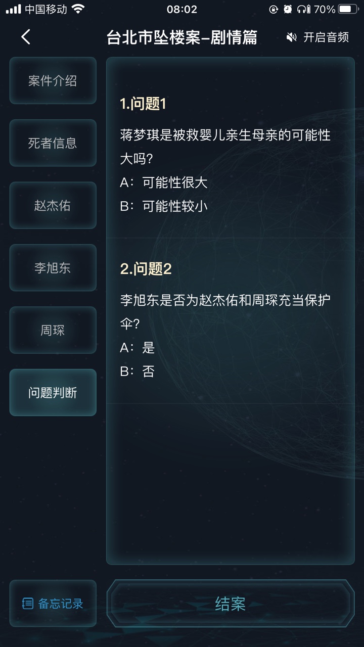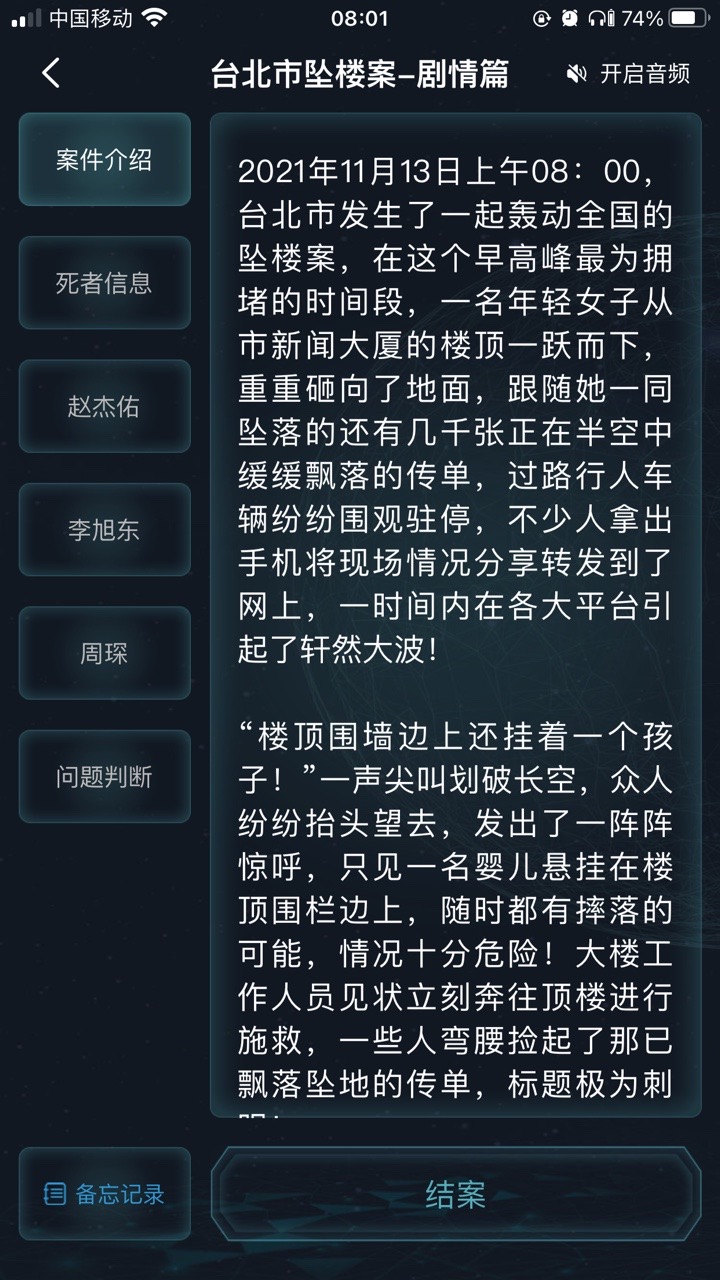 犯罪大师台北市坠楼案剧情篇问题答案: