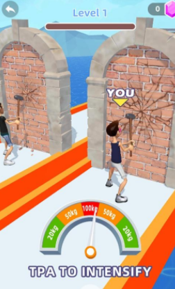 指针在上面来回浮动,点击屏幕让指针停在力气最大的地方,人物就会砸门,