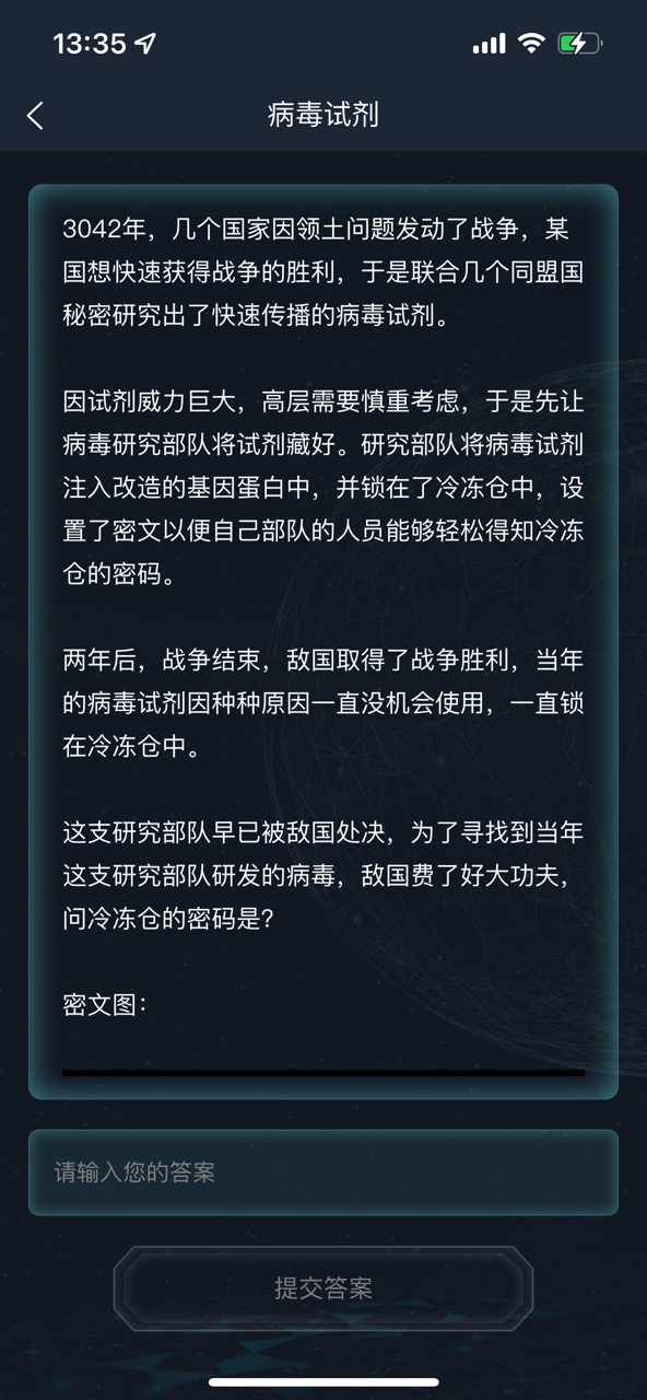 这支研究部队早已被敌国处决,为了寻找到当年这支研究部队研发的病毒,敌国费了好大功夫,问冷冻仓的密码是?