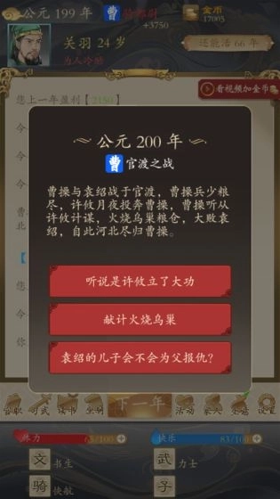 《三国人生》最新版来袭,这可是一款可玩性超强的策略塔防手游,完全符合玩家心中对顶级游戏类型的期待。其剧情趣味性十足,一旦上手就根本停不下来,赶紧来感受一番!游戏以三国时代为背景,能让玩家从多元视角领略三国时期的风云变幻,尽情体验各类人生经历与冒险,打造专属于自己的三国传奇篇章。它主打开放、自由的风格,给予玩家充分空间展现自身才华与决策能力,玩家可以挑选不同角色进行扮演,从普通士兵到一国之主,感受截然不同的人生轨迹。