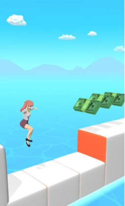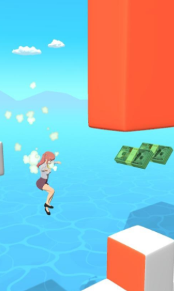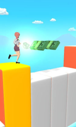 3、需要通过升台阶的高度来完成,女人在道路上奔跑,向着钱币进发。