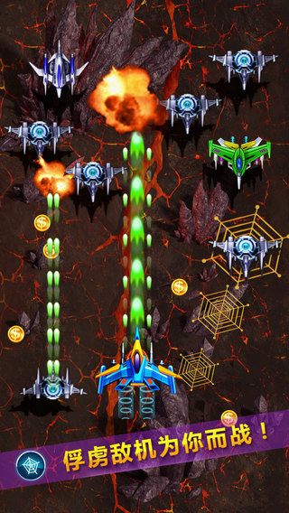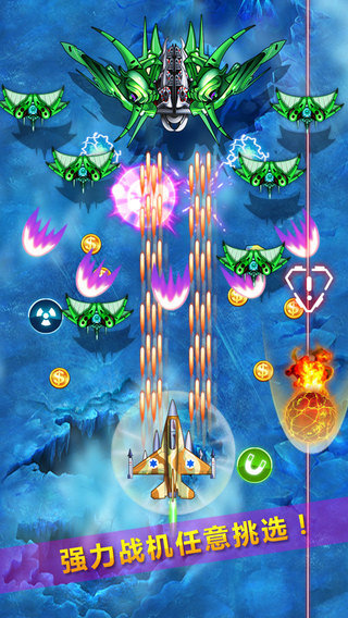 1.我方有8种战机可以出战!45级火力、复活、吸收道具、冲刺加倍、双倍火力、双倍金币变大等等技能让你爱不释手!