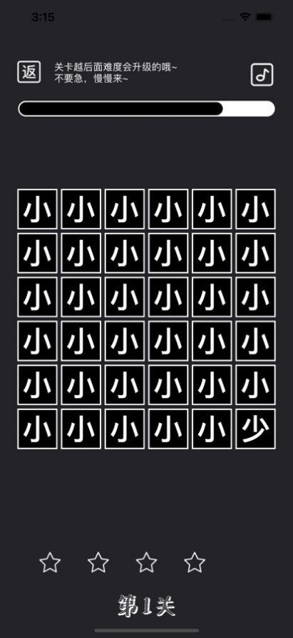 3、找出错别字或不一样但很像的字,点击即可到达下一关,关卡难度共分为6级,一级难度有5个关卡