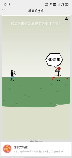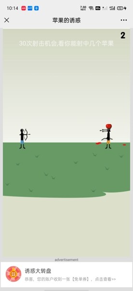 苹果的诱惑用户可以体验各种不同的射击角度,让对方头顶的苹果被顺利击落,多种魔性的冒险角度,轻松收获各种不同的爆笑经历,超好玩的挑战内容,使玩家有各种不同的手游玩法,30次射击机会,看你能射中几个苹果,考验自己的射击技术。