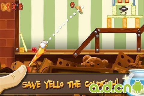 一条小黄鱼,被丢在了台子,它很无奈也很无助,不过你可以帮助它回到鱼缸里。 其玩法上又是和愤怒的小鸟差不多的模式,当鱼被放下来时,根据周围的环境与障碍的摆放,拉着鱼尾,把小黄鱼弹射出去,目的地就是鱼缸。 期间你还需要破坏那些小玩具,比如:洋娃娃、小熊之类的,那些小玩具可以帮你获取很高的分数。 还有就是要注意,当你被障碍物压住的时候,点击小鱼,它可以咬碎周围的物品,不然在你弹射时会受到影响。