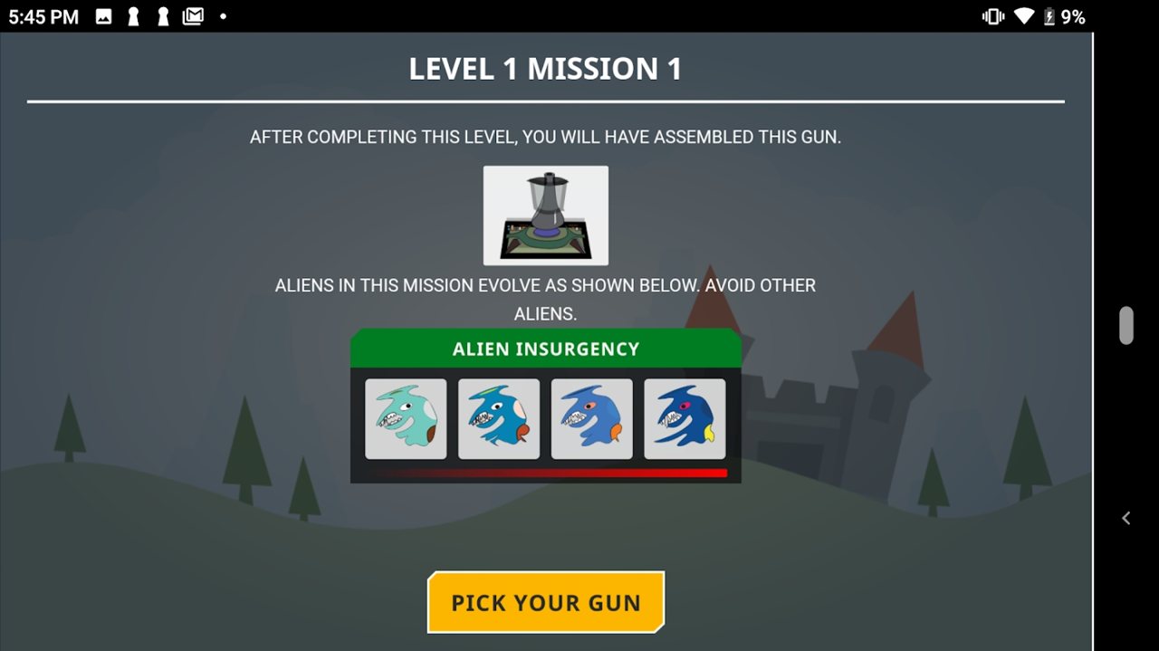 如果您在计时器用尽之前将所有目标外星人转换为他们的最高进化阶段,则说明您已经完成了该等级,并且您将获得一个组件,该组件将组装到您的下一支枪中。每把枪有十个组件,当您收到每个组件时,您会看到枪开始成形。