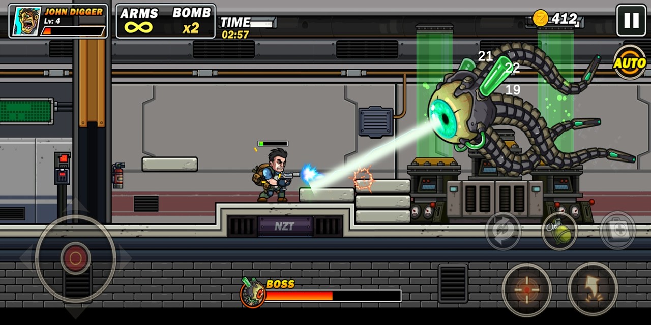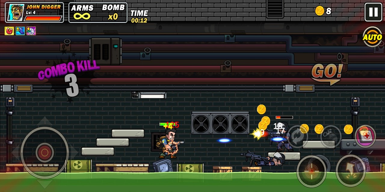 这是第三人称2D街机射击手游,可让您与敌方士兵,装甲车辆和巨型首领战斗。许多阶段和大量武器...保证乐趣,立即下载!
