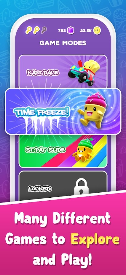 扮演疯狂角色等您最喜欢的小吃; Magic Dein纸杯蛋糕,Goub冰淇淋吧,Funky Fries,Slushy,Hotdog,Popcorn等!您不仅可以将其作为自己喜欢的小吃,还可以对其进行自定义。挑选出他们的脸,他们的骑行方式,并在途中进行更多定制!每种手游模式都允许您升级角色。因此,它们可以运行得更快或更强大。