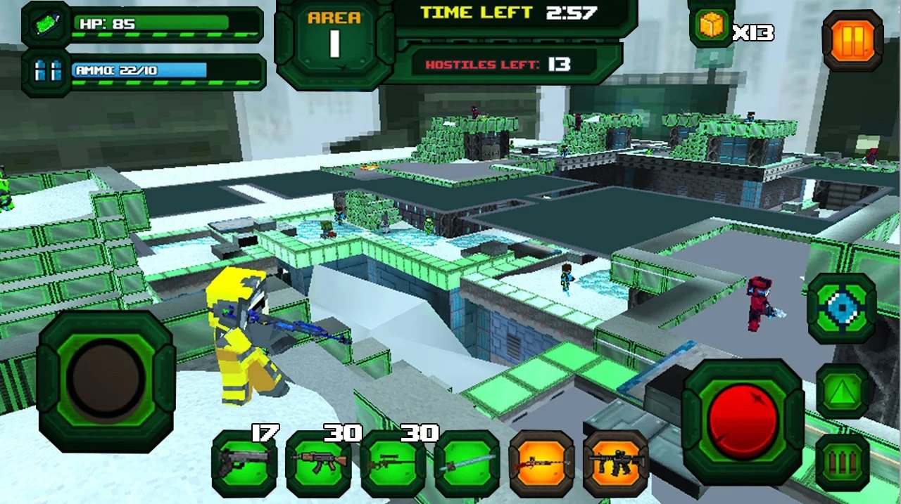在这个快节奏的手游中,不断的挑战等待着您,您必须克服一切障碍并击败每个敌人。随着进度的进展,释放强大的军用级武器和步枪的武库。明智地使用弹药,并照顾好您的健康,因为敌人的猛烈袭击随时可能袭击每个角落。拯救块状宇宙免于大规模入侵是您的责任。