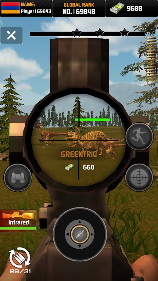 在这个狩猎模拟手游中,我们将直接带您到狩猎现场。举枪直视目标,瞄准重要器官,不断磨练技能,并打出完美的狩猎路线。正在进行荣誉追捕。在您的视野中,您每次都能看到不同的恐龙。为了实现这一目标,狩猎更有价值的恐龙。在野生猎人中,您无法确定这种恐龙的价值。您必须查看指南。这将帮助您更好地狩猎。如果您不愿意再次射击,这些可爱的家伙将在您永远不会打的地方奔跑。