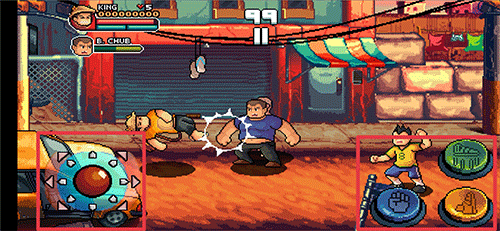 3、游戏开启后,通过左边轮盘操控角色移动,右边的绿色按钮用于跳跃,黄色按钮是脚踢,蓝色按钮为拳击。玩家需巧妙运用这些招式来战胜敌人。