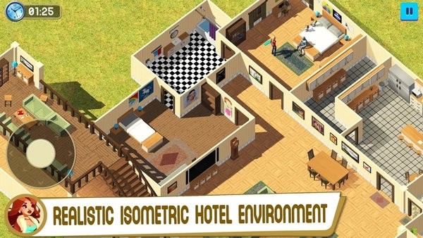 采用写实风格的3D画面,从家具摆设到人物表情都刻画得细致入微,配合动态光影效果,营造出真实生动的酒店环境。
