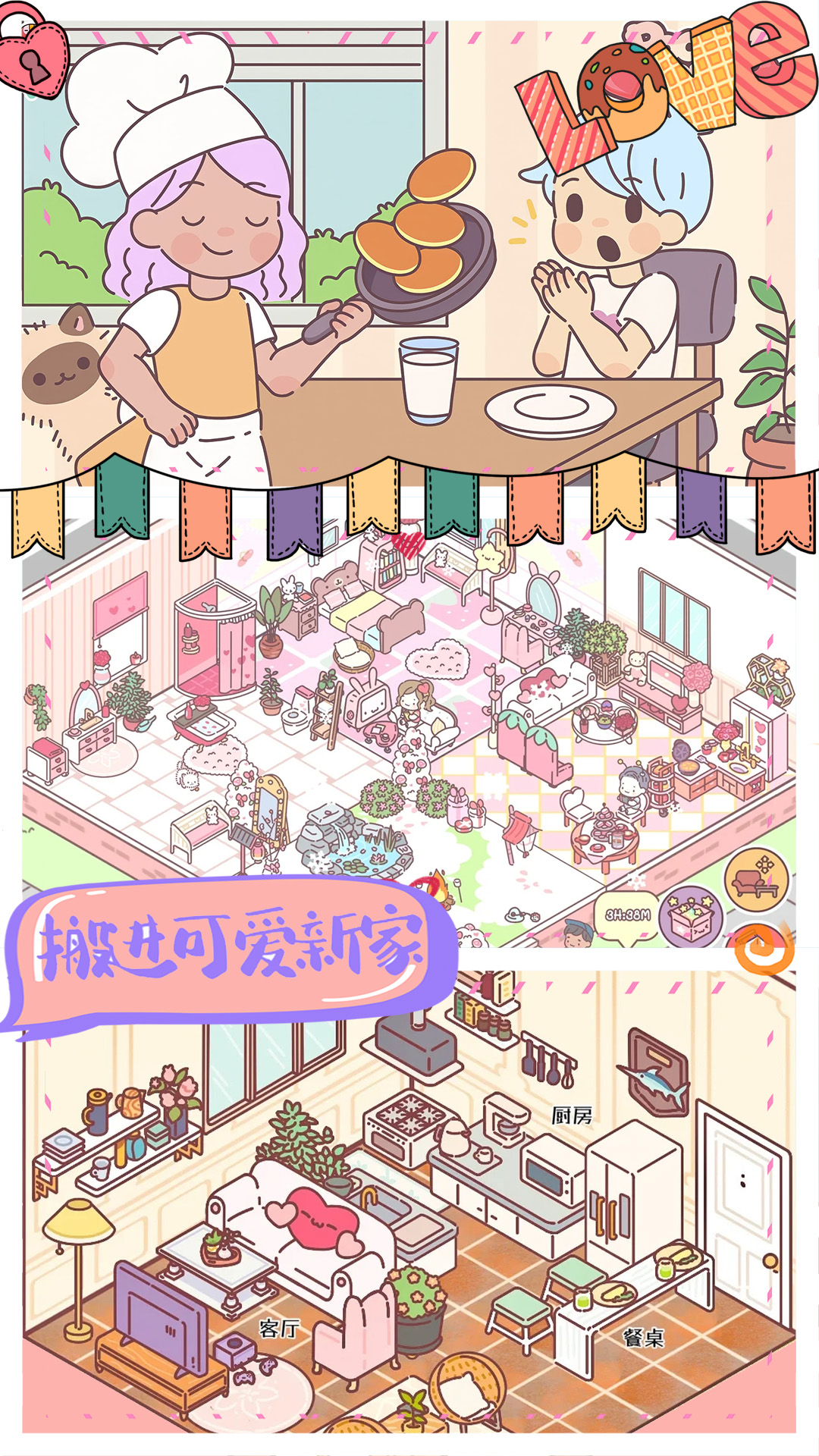 游戏提供了海量的家具、电器和装饰品供玩家选择,每个房间都可以按照个人喜好进行定制。如果你不想花费太多时间搭配,也可以直接选择游戏精心设计的主题家具套装。通过巧妙的布置,你可以打造出专属于两个人的浪漫空间,还有各种可爱的宠物陪伴左右。