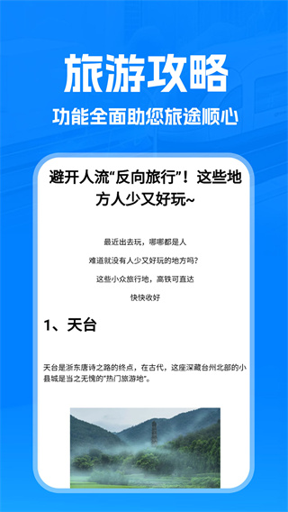 设置了车票咨询,用户可以通过APP查看不同的旅行攻略以及资讯,帮助用户更高效安排旅行行程,或者疑问。平台定期更新各地旅游景点介绍和交通指南,并设有专业客服团队随时解答用户问题。这些贴心的服务让旅行规划变得更加轻松愉快。