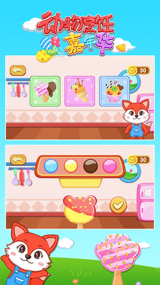小狐狸热衷的冰激凌——游戏提供丰富的冰激凌制作工具和原料,小朋友可以自由搭配果汁、果酱和装饰品。通过实际操作榨汁机、模具等工具,了解冰激凌的制作过程,培养动手能力和审美能力。