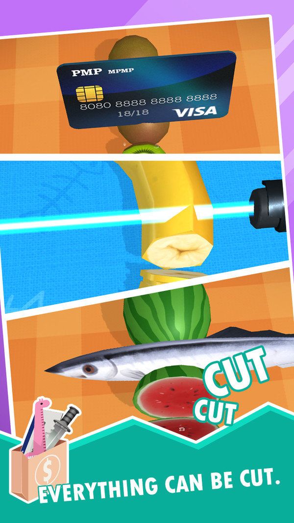 游戏提供丰富的切割工具选择,包括传统刀片、电动锯子、高科技激光等。每种工具都具有独特的切割特性和适用场景,玩家需要根据物体材质和切割要求做出明智选择。例如,激光适合切割金属,而刀片更适合处理水果。