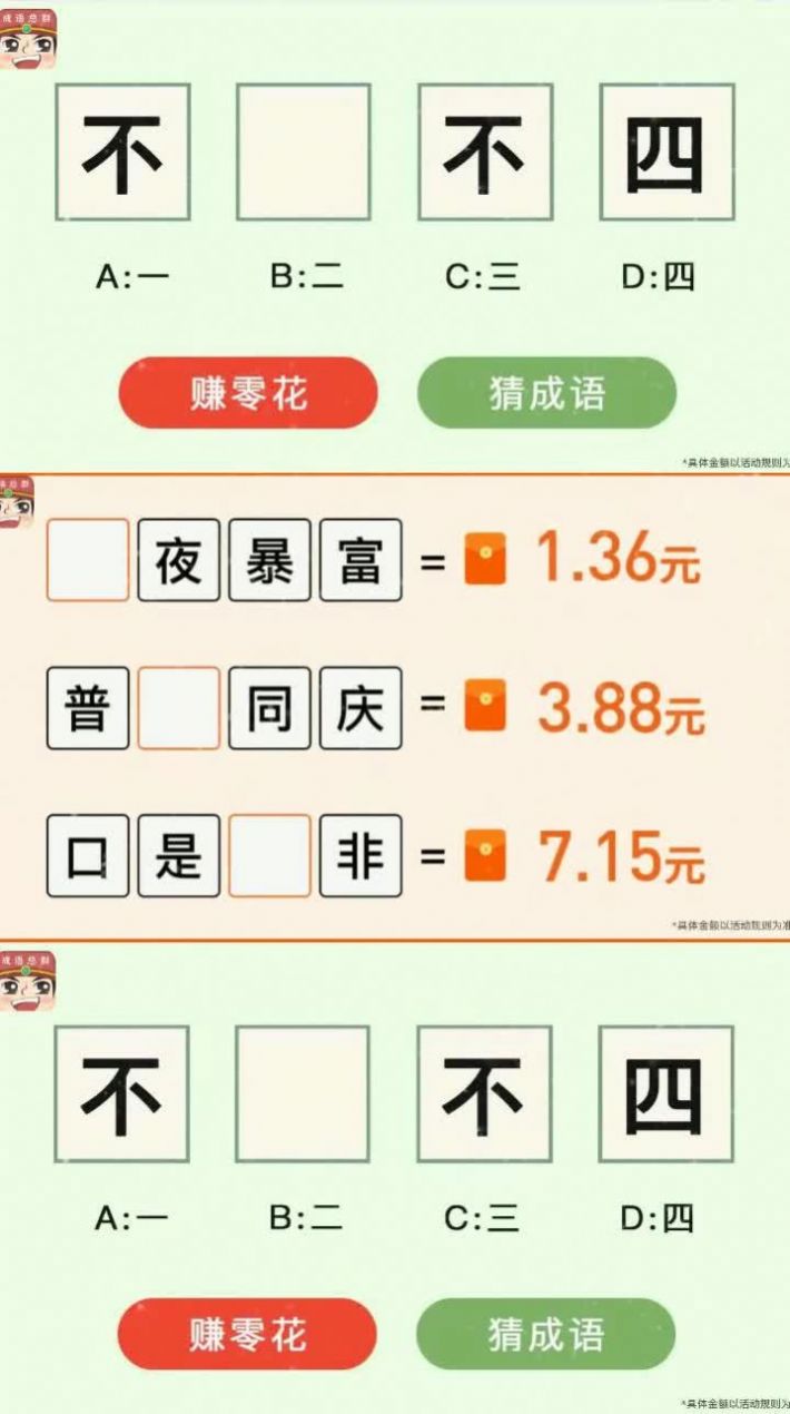 成语分红版是一款集休闲娱乐与知识学习于一体的创新性手游,它将传统成语文化与现代游戏玩法完美结合,为玩家带来前所未有的成语闯关体验。在这款游戏中,玩家可以尽情探索丰富多彩的成语世界,通过挑战各种精心设计的关卡来赢取丰厚的红包奖励。游戏采用轻松有趣的模拟闯关模式,让你在享受游戏乐趣的同时,还能不断提升自己的成语知识储备。