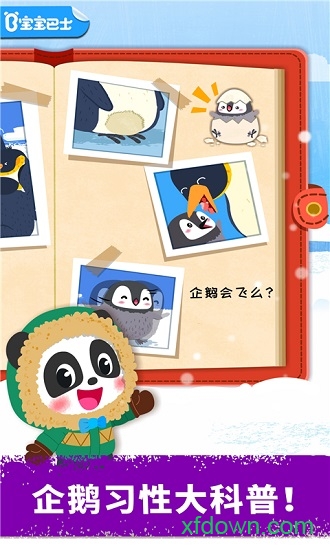帝企鹅长什么呢?宝宝去瞧一瞧吧!游戏通过3D建模真实还原企鹅外形特征,黑黑的羽毛,雪白的肚皮,还有一对小翅膀,走起路来一摇一摆的。玩家可以360度观察企鹅的每个细节,了解它们独特的身体结构。