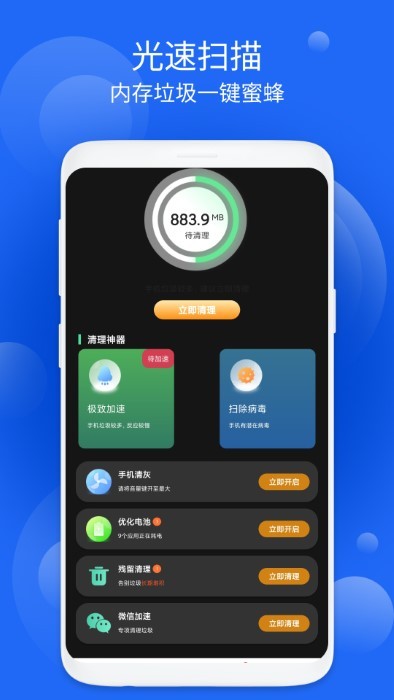 光速扫描技术让垃圾清理变得前所未有的高效,只需轻点一键,即可完成全面清理。智能病毒查杀功能采用多重防护机制,确保您的手机远离恶意软件威胁。实时网络风险检测系统会主动拦截可疑连接,保护您的上网安全。通知栏清理功能可以智能管理各类推送信息,还您一个清爽的使用环境。