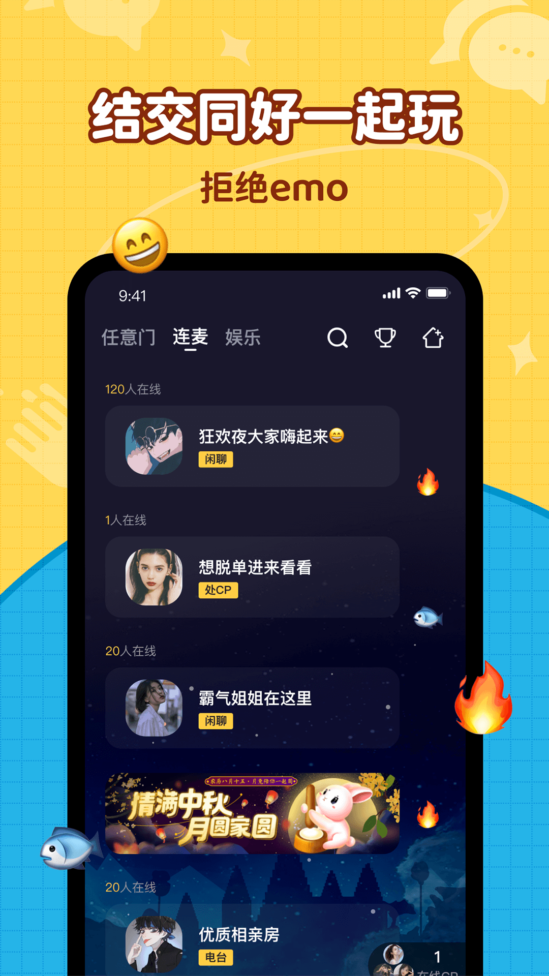 连麦陪伴温暖你,告别孤单。24小时不间断的语音陪伴,无论是学习工作还是深夜失眠,都有人陪你聊天。