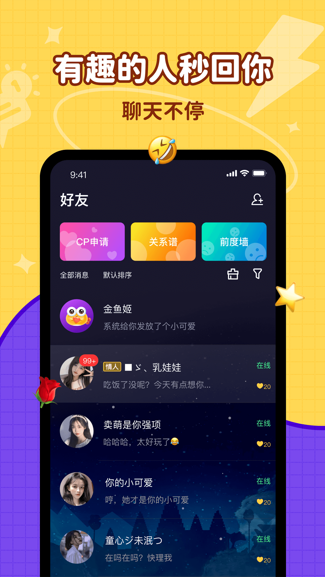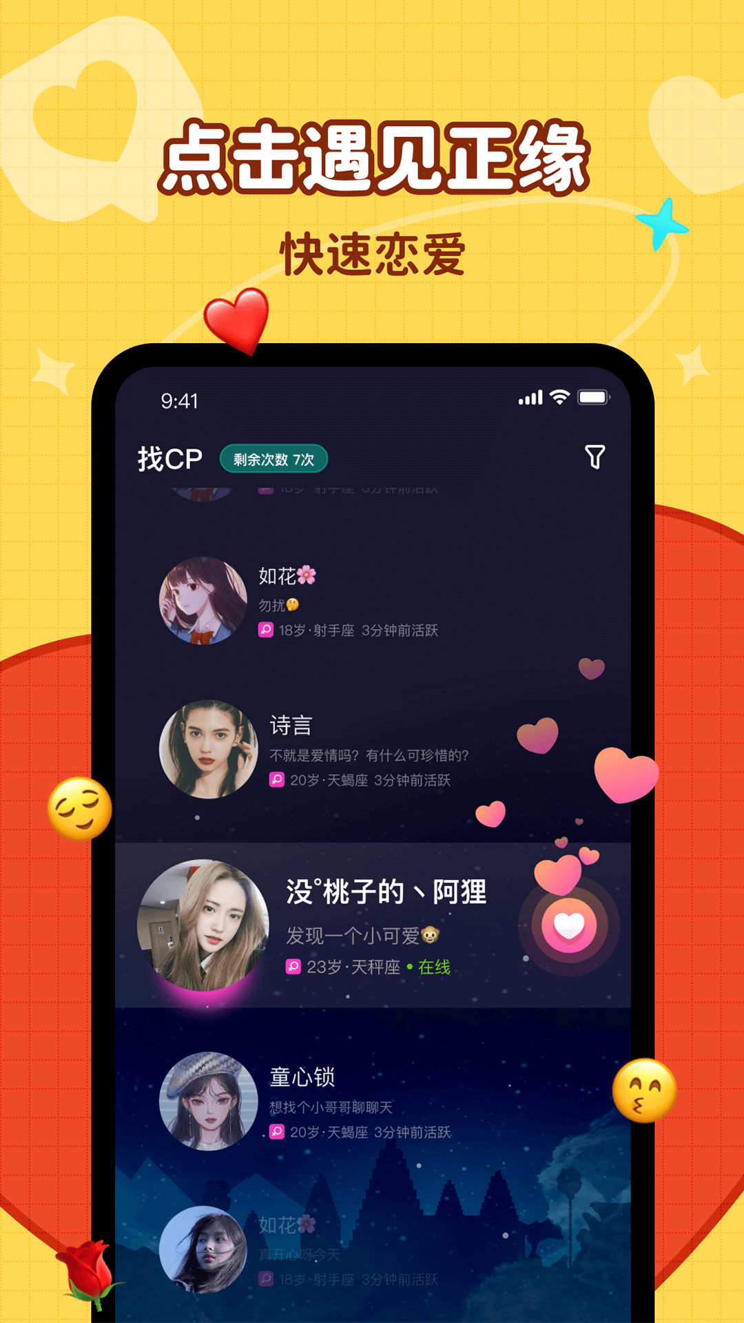 交友速配,开启浪漫之旅,还可以与你心爱的ta点亮专属契约哦~平台提供多种互动小游戏和情侣任务,帮助你们快速升温感情。每日CP挑战和专属纪念日提醒功能,让你们的感情持续保鲜。