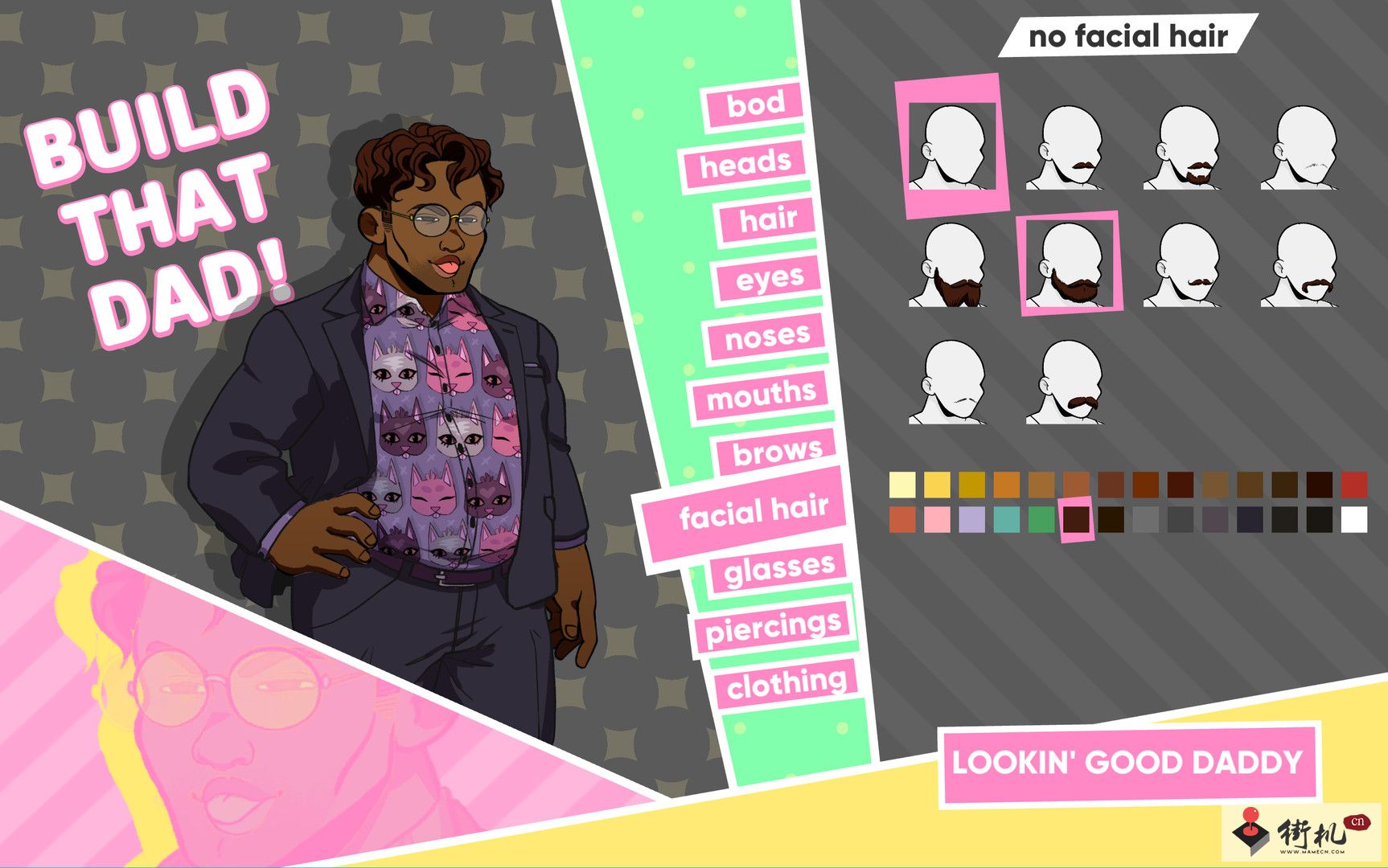 款游戏的独特之处在于——你的邻居们也都是各种职业的单身辣爹。本作中玩家控制的单亲爸爸可以和7位不同的单身父亲约会,而且每位老爹都存在多个结局,每种路线还有多种“爸爸主题”(Dad themed)的小游戏可供游玩。另外,本作的语音和场景也相当齐全,玩家们也可以自行设定控制的老爹的形象。