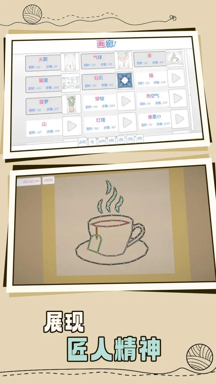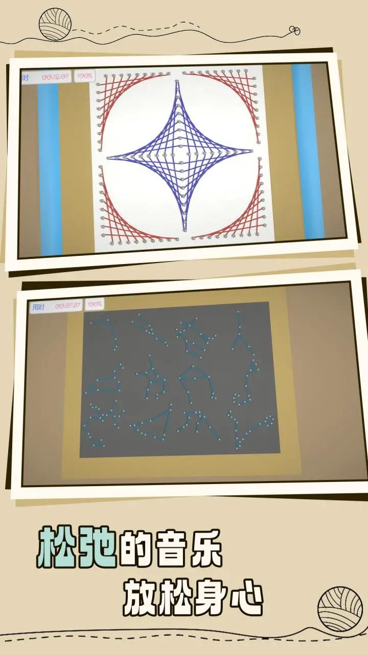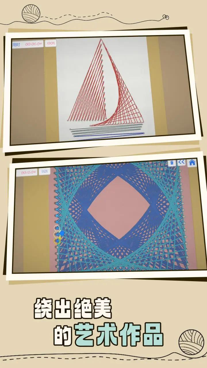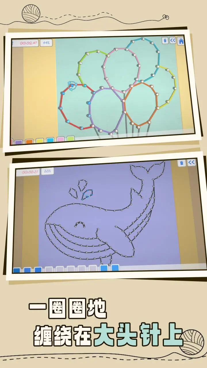 游戏操作简单直观,玩家只需通过拖拽纱线,将其一圈圈地缠绕在画布上各式各样的大头针上。随着你的每一次缠绕,美丽的图案会逐渐显现,最终形成一幅令人赞叹的编织作品。游戏强调慢工出细活的过程,让你能够静下心来,享受每一根线带来的变化。在创作过程中,你可以从现有关卡的优秀作品中汲取灵感,同时伴随着令人放松的优美配乐,让整个创作过程成为一种享受。