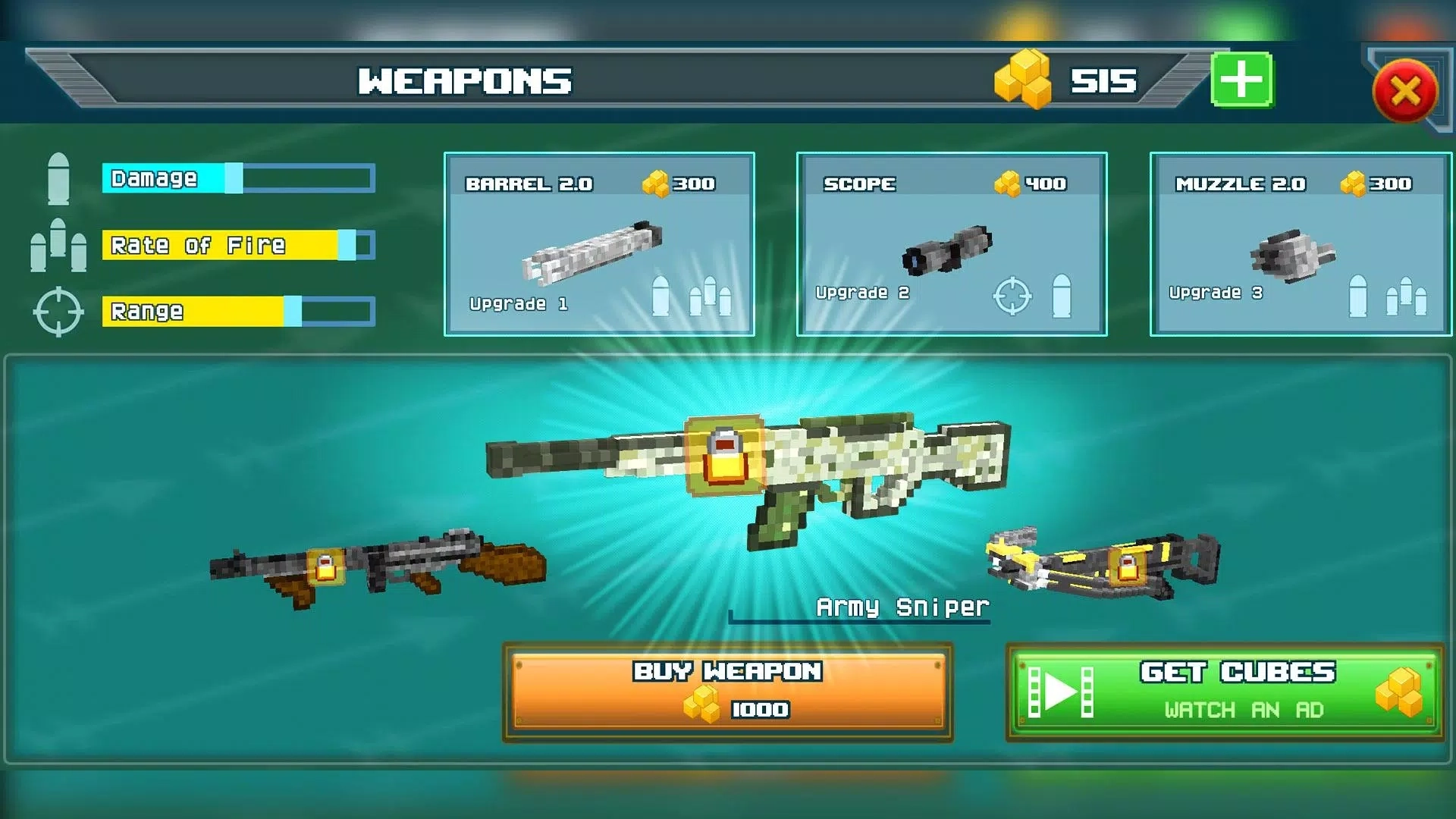 3、丰富的模式选择,包含闯关以及自定义的玩法,收集方块和武器,享受射击的爽快体验。
