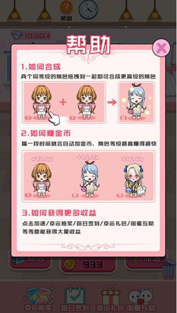最新颖的游戏玩法,最简单的游戏体验,几乎不需要任何的操作,就能享受到过瘾的趣味,你的美少女角色将会在不断的合成中诞生,相同角色合并,将会诞生出更加高级的角色。