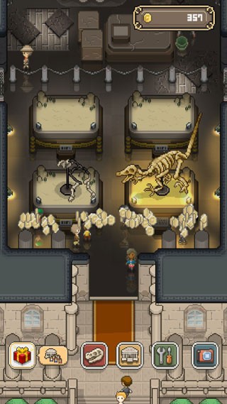 我的化石博物馆更新版创造了一个轻松的放置类游戏,融入了独特的挑战元素。游戏中大量使用了经典的像素风格,以简洁的画面为玩家呈现了精彩的场景。从内容上看,游戏包含了丰富的收集和经营要素,并且拥有清晰的轮廓和简洁细腻的色彩分区。在游戏中,你将扮演一家衰落博物馆的馆长,需要外出探险挖掘不同种类的恐龙化石,并将它们展示在博物馆中供游客观赏。此外,每次游客参观结束后,你还能获得一定收益。你需要积累金币来升级博物馆设施,不断挖掘新的恐龙化石。同时,利用丰富的展品吸引更多游客,并对博物馆进行全面升级。你必须不断增加游客流量,提高挖掘工人数量和工具等级,不断扩大经营范围,增设展柜,收藏更多文物。