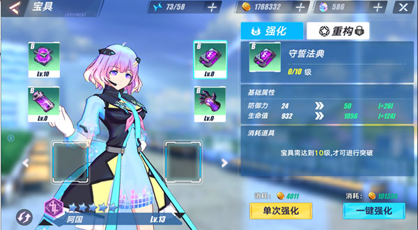 选中一个宝具位置,可以通过消耗金币,将宝具强化升级。强化每个阶段有等级上限,当达到上限后,需要将宝具突破才可继续升级。突破的材料可以从精英关卡获得,已三星通关的精英关卡可以直接扫荡;未解锁的关卡需要把精英关卡继续往后推关