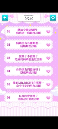 《病娇诊断》中文版是一款趣味十足的模拟测试类手游。在游戏里,玩家们能够检测自己是否属于Menhera,即病娇。整个检测过程轻松简单,只需回答游戏中的问题,并点击对应的插图给出答案,最后便会得出详细的诊断结果,让玩家能轻松直观地知晓自己病娇程度究竟有多深。