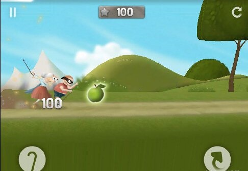 在游戏中老奶奶需要抢在盗贼前拿到苹果,顺便还要在路上赚取购买道具的金币,每次成功跳跃都会获得评价分数。