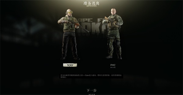 游戏开始时,玩家可以从Scav和PMC两个阵营中选择一个进行游戏,其中PMC代表玩家自己的角色,而Scav则相当于扮演游戏中的非玩家角色(NPC)。