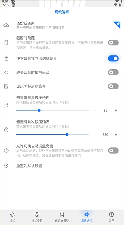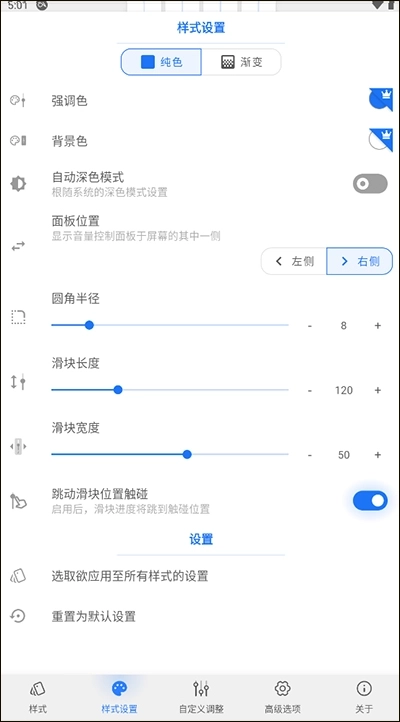 2、自定义功能主要体现在样式设置,也就是外观修改,以及对一些操作习惯进行“定制”。在“样式设置”里,能够设置“音量调节滑块”的强调色与背景颜色,还能设置面板的位置、调节的圆角半径、滑块长度和滑块宽度。