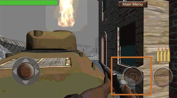 当我们进入游戏,会跟随一支小部队抵达战场。随着馒头坦克被击毁,队友纷纷倒下,此刻就该我们一展身手了。值得留意的是,在游戏里子弹不会自动上膛,玩家需自行操作,点击红色方框中的按钮来完成上膛动作。