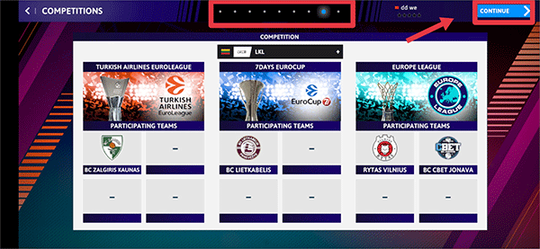 1、进入游戏后,首先按照进度条选择游戏难度,地区,对手等一系列问题,选择后点击右上角CONTINUE