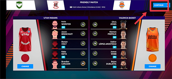 5、待队员全部训练好后就可以进入比赛环节了,首先看到的是比赛的阵营,了解后点击右上角CONTINUE