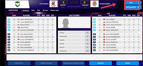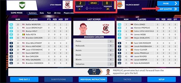 7、游戏开始后玩家可以在上方查看本场分数情况,一句有10分钟,玩家若不想等待时候的话,可以点击SKIP QUARTER来跳过