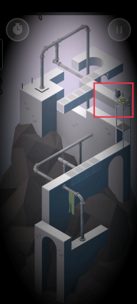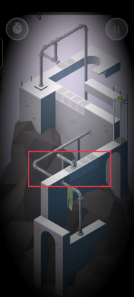 玩家需要选择红色框框的把手进行旋转,从而铺出机器人不断走动的路线,到达绿色按钮的位置。
