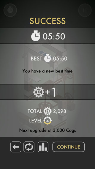 1、游戏是以闯关的形式进行,具体有多少个关卡小编并不知道。关卡优劣的评判标准是通关时间,越少时间通关可以获得越多齿轮。